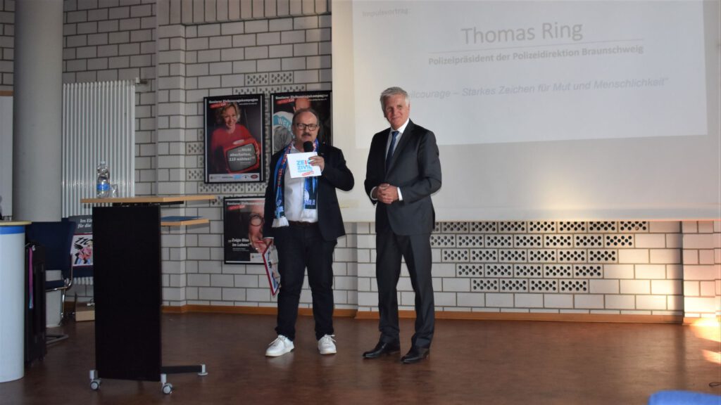 Polizeipräsident Thomas Ring brachte aus Braunschweig seinen Dank und seine besondere Wertschätzung für die zu ehrenden Gäste zum Ausdruck. In seinem Statement betonte er die besondere Rolle der Zivilcourage als Pfeiler unserer Gesellschaft, sie sei ein starkes Zeichen für Mut und Menschlichkeit. Unsere Gesellschaft sei angewiesen auf Menschen, die Haltung