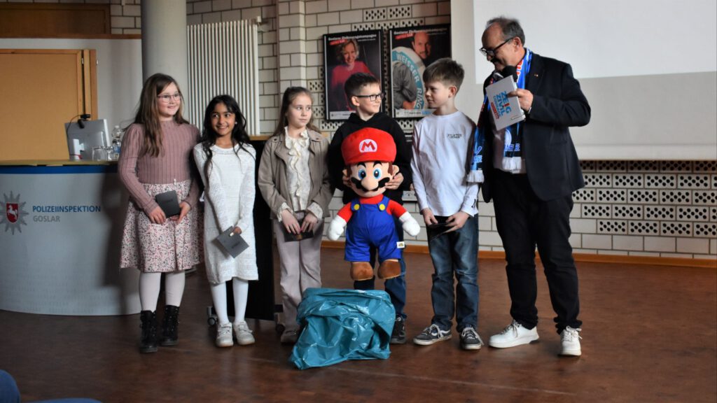 Die Schüler der Grundschule Oker überraschte er mit einer großen Super Mario Puppe und Kinokarten vom Cineplexkino.