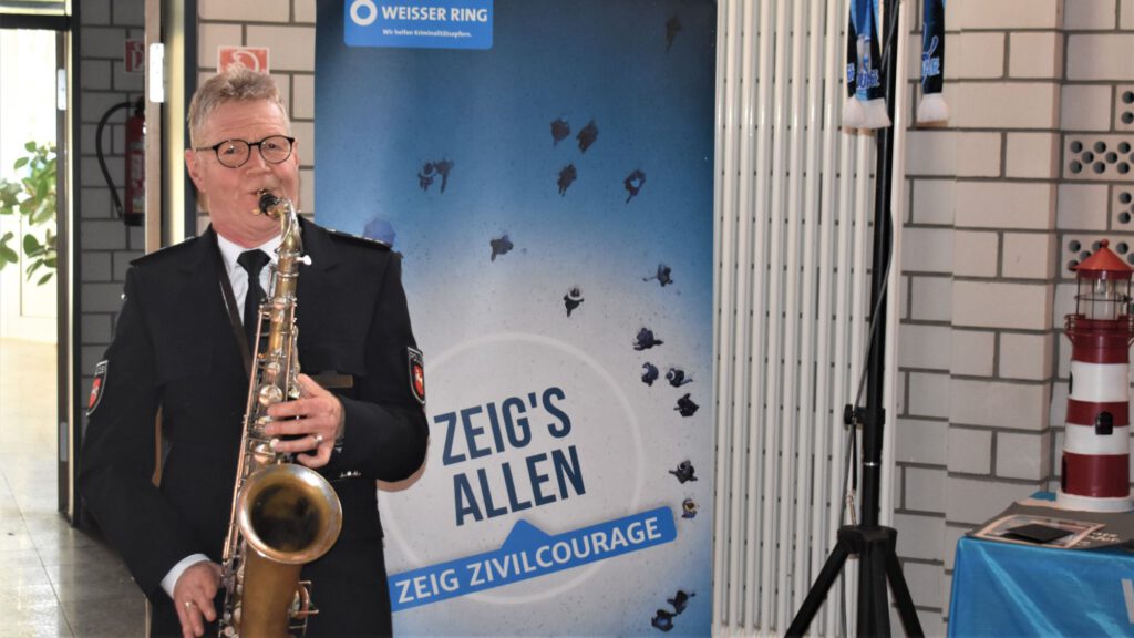 Musikalisch begleitet wurde die Veranstaltung erneut durch Uwe Klußmann vom Polizeiorchester Niedersachsen. Der Moderator des Tages, Günter Koschig, Projektleiter und Initiator der GZK, dankte Uwe Klußmann, Denis Habig und Marion Kreft von der Polizei für ihr 15jähriges Engagement jeweils mit einem Leuchtturm von der GZK sowie den Laudatoren mit einem 110-Cartoon.