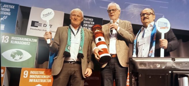 applaudierten, als der Geehrte gerührt den großen Leuchtturm entgegennahm und das