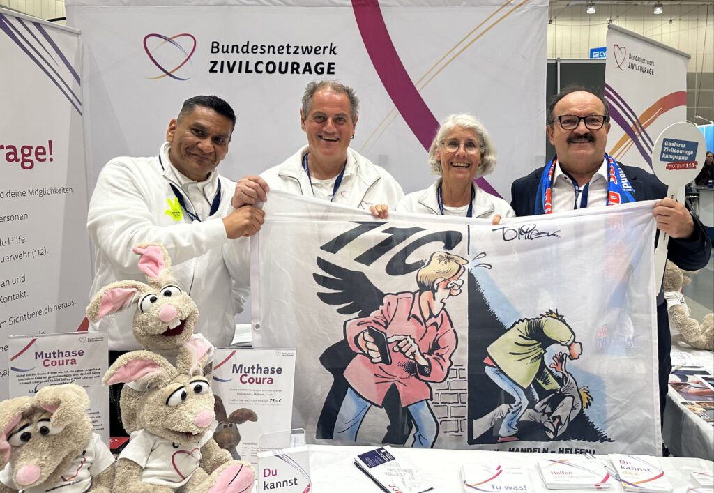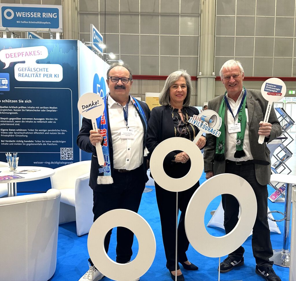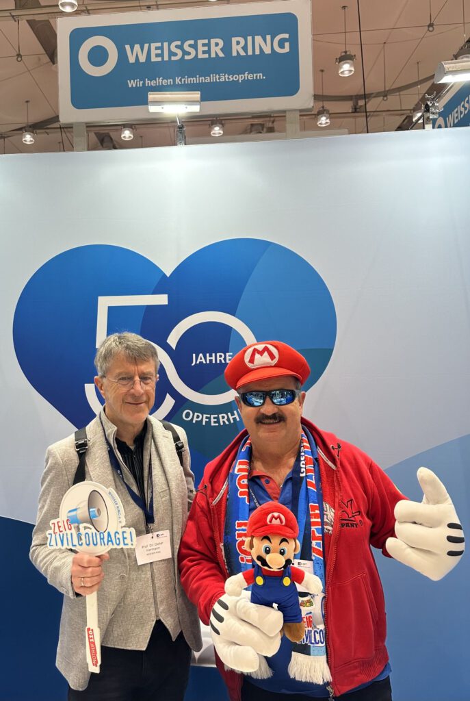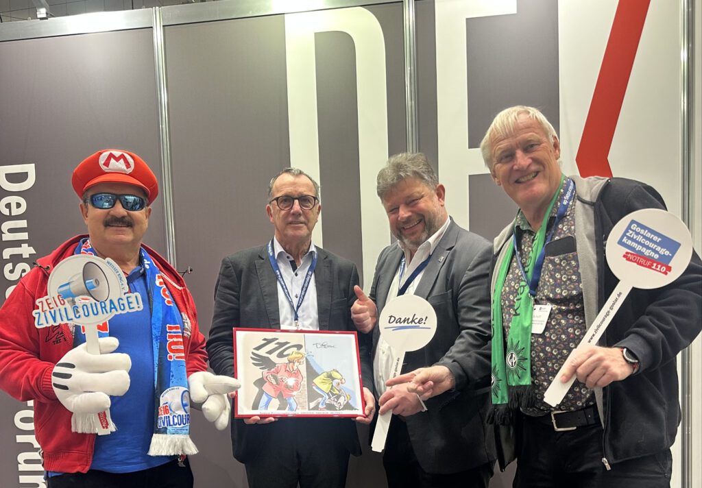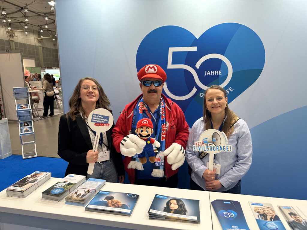 der als Ex-Polizist mit Koschig in Grundschulen den Kindern vermittelt, wie man in Gefahrensituationen richtig hilft, ohne sich dabei selbst zu gefährden sowie Empathie für Opfer zeigt. Am Stand des Weißen Ringes, der in diesem Jahr 50 Jahre für Opfer Hilfe und Prävention steht, zeigten die beiden Goslarer mit der Bundesvorsitzenden Barbara Richstein „Flagge“. Die Botschaft „Prävention ist Brandschutz, kein Feuerlöscher!“